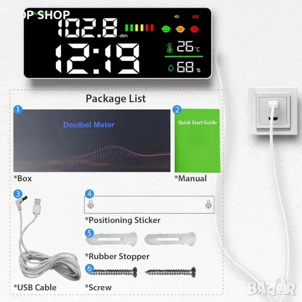 МОНТИРАН НА СТЕНА ] Предлага се с винтове и отвори за окачване за лесен монтаж. За разлика от старомодните шумомери, които трябва да се държат в ръка за измерване, този подобрен шумомер може да се монтира на стената или свободно на масата.