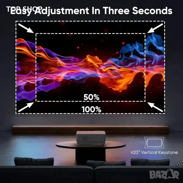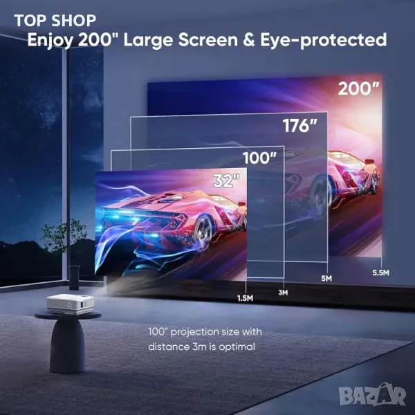 Преносим и се наслаждавайте на максимум 200-инчов екран: благодарение на компактния му размер можете лесно да го вземете със себе си в движение или да го поставите навсякъде в дома си, без да заема много място. Въпреки че размерът на проектора е малък, той може да прожектира екрана от 35 инча до максимум 200 инча чрез регулиране на прожекционното разстояние от 1,5-5 m. В допълнение, с функцията за мащабиране можете да регулирате размера на проекцията от 100%-50%, без да местите проектора.