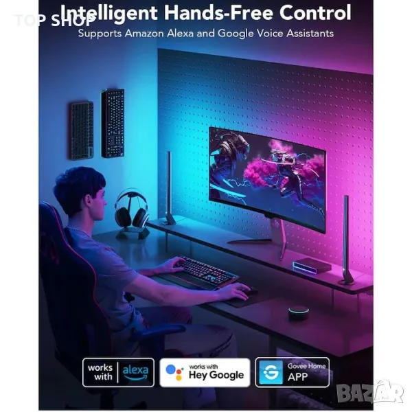Комплект 2 RGBIC LED лампи + Govee H6601 AI Gaming Sync Box, AI светлинни ефекти, 3 HDMI