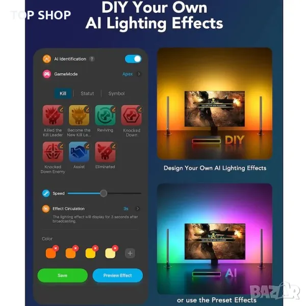 Изпитайте осветлението на станцията AI Gaming Sync Box Kit с AI чип и усъвършенстван алгоритъм, който разпознава вашите действия в играта в реално време и задейства съобразени със ситуацията светлинни ефекти върху RGBIC подсветката и интегрираните светлинни ленти. Освен това се насладете на бързо и точно съвпадение на цветовете за цялото ви гейминг, филмово и развлекателно съдържание