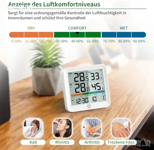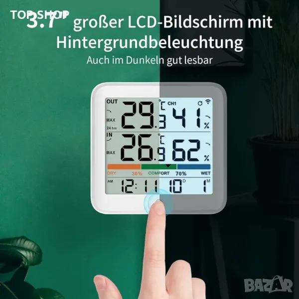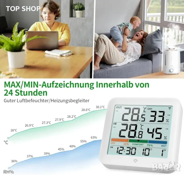 Мултифункционален хигрометър, термометър, който следи температурата (℃/℉ с възможност за превключване) и влажността, 12/24-часов дисплей на датата, индикатори за комфорт, тенденции със стрелки за температура и влажност, икона за изтощена батерия. Също така показва Max/Min запис и автоматично изтриване на данните от измерването след 24 часа.