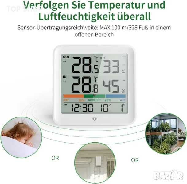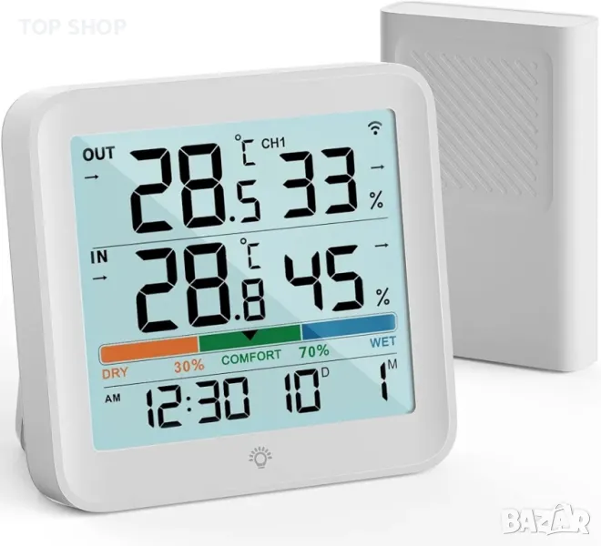 Безжичен термохигрометър с 1 канален монитор: тази метеорологична станция с вграден сензор и 1 безжичен сензор (IP43 водоустойчив), може да се свърже за показване на показания за температура и влажност отвън на закрито до 100 m/328 фута на открито.