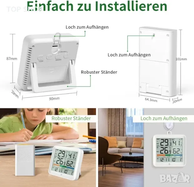2 опции за монтаж - Вътрешен хигрометър с отвор за окачване на стената и разтегателна стойка на гърба, външен сензор с окачване, лесен за закрепване към стената или поставяне на масата.