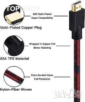 Висококачествени материали: Медни проводници с висока чистота за възможно най-доброто предаване на сигнала без загуби, плътност и многократно екраниране за защита срещу сигнали за смущения, двойно екраниран, HDMI конектор,
