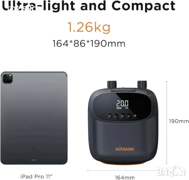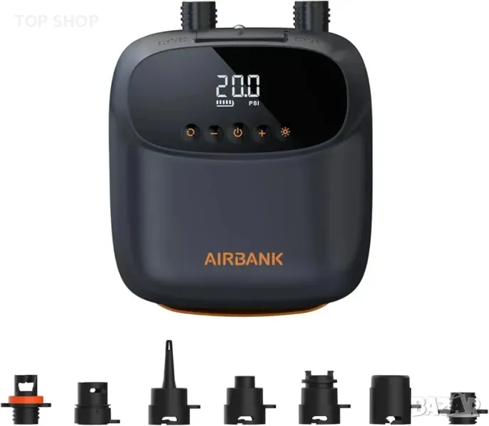 Автомобилен конектор и дюзи: Включва се в 12V DC конектор на вашия автомобил. Със 7 висококачествени накрайника от найлон и фибростъкло, акумулаторната помпа AIRBANK може да надуе с лекота всичките ви дъски за гребла (включително C7, D7 клапани), фолио за крила и хвърчила, каяци, басейни, плувни кръгове или други надуваеми устройства. Просто задайте желаното налягане и оставете помпата да свърши работата, спирайки автоматично при достигане на целевото налягане.