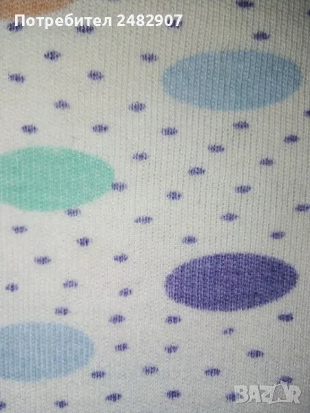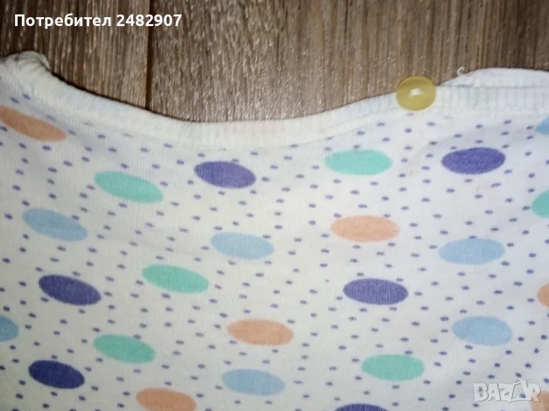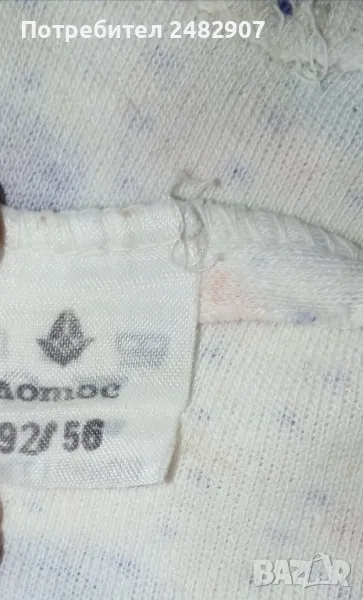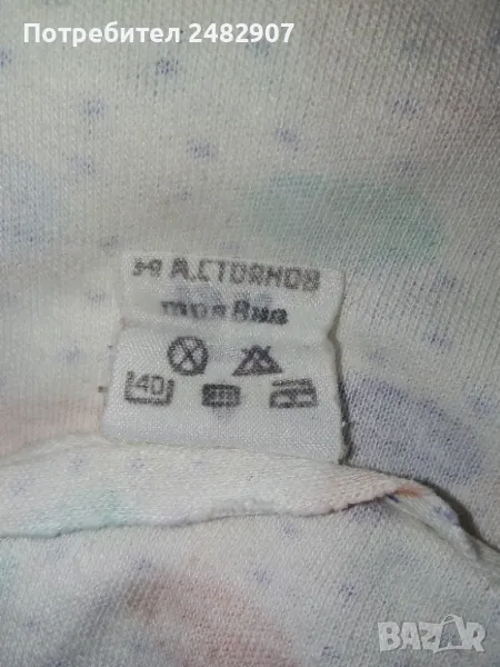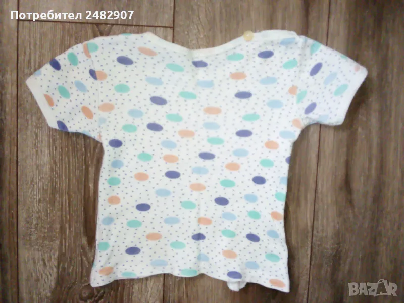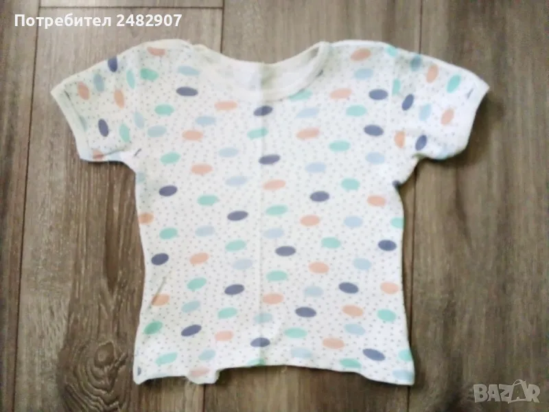 Ретро бебешка тениска от времето на соца за ръст - до 92 см. Ширина в раменете - 27 см, ширина под мишниците - 29 см, ширина в долната част - 29 см, дължина от рамото до долу - 31 см, дължина на ръкава от рамото - 9 см, ширина на ръкава в долната част - 8 см. Запазена, с нормални следи от износване, 100 % памук.