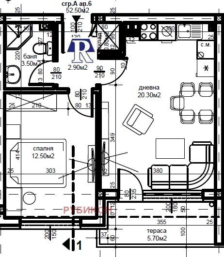 Разпределението на апартамента е както следва: просторна дневна с кухненски бокс( 20.30кв.м),спалня(12.50кв.м), баня с тоалетна(3.50кв.м), антре(2.90кв.м),тераса(5.70кв.м) и склад(0.8кв.м.). Застроена площ 52.50 кв.м. Общи части - 7,06 кв.м. Обща площ- 59.56кв.м. Изложение ЮГ!