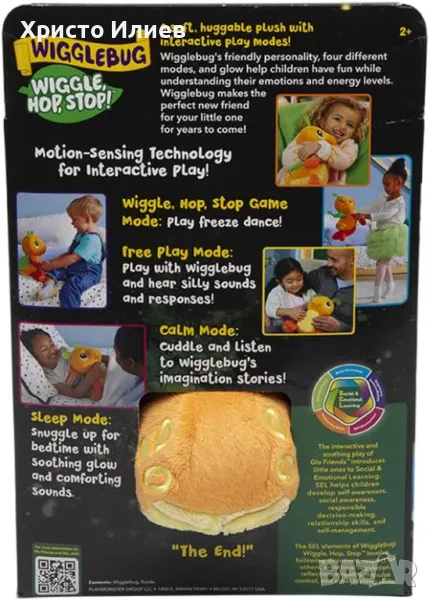 Приятелската личност на Wigglebug, четири различни режима и блясък помагат на децата да се забавляват, докато разбират своите емоции и енергийни нива, светещи оранжево за активен режим и синьо за спокоен режим. Wigglebug прави идеалния нов приятел за вашето малко дете за години напред!