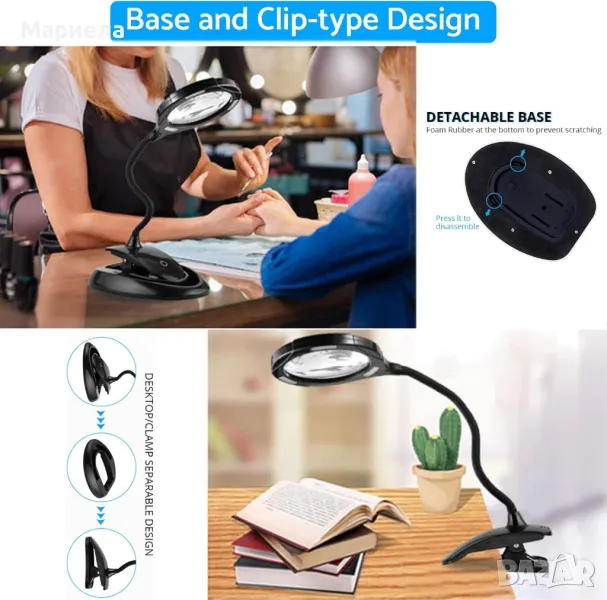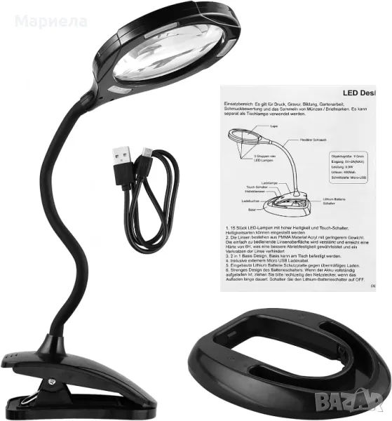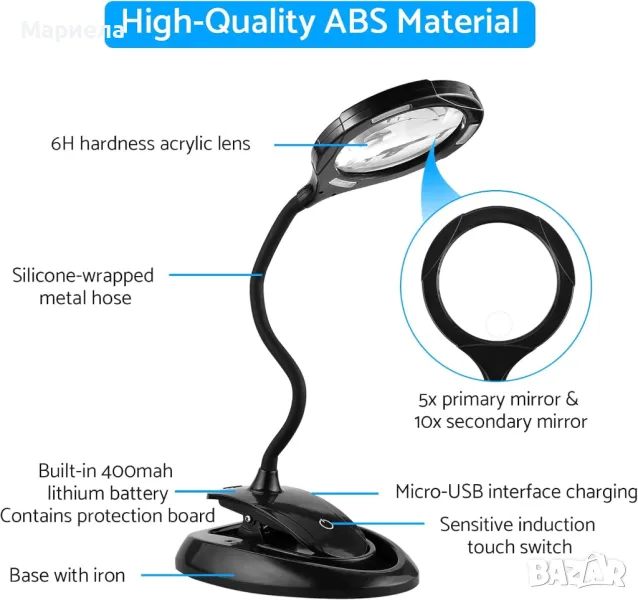 LED акумулаторна лупа-х5;х10 със светлина/2-в-1 настолна лампа и скоба 3 цветни режима