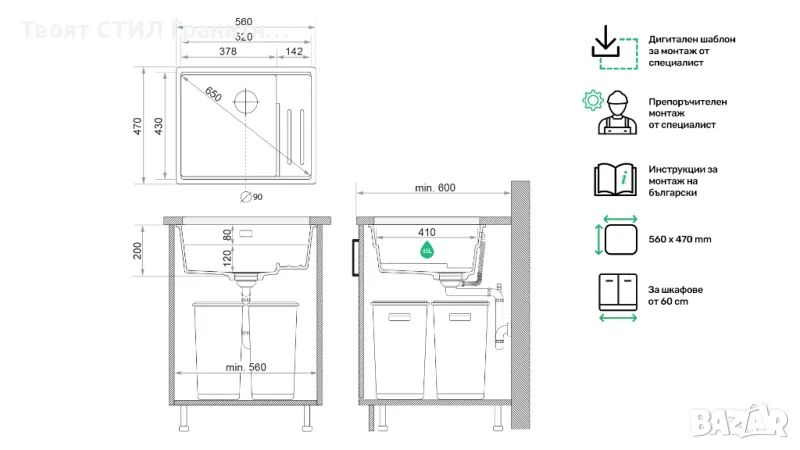 - Монтаж под плота: Осигурява безпроблемен външен вид и увеличава максимално пространството на плота.