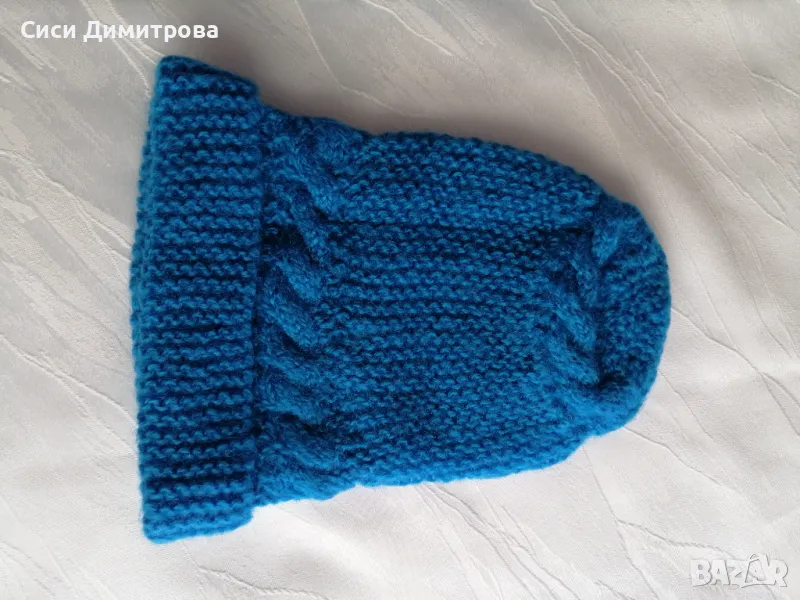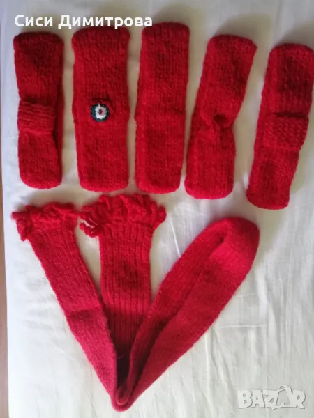 Сини шапка и шал комплект. Ръчно плетиво. Прежда: мохер. Първи модел размери: шапка с плитки: обиколка - 35 см, височина - 25 см ; шал тип "комин" d - 60 см, височина - 20 см. Втори модел размери: шапка: обиколка - 50 см, височина - 25 см; шал с ресни: дължина-120 см, ширина - 25 см. Трети модел: червен шал с дължина 150 см и ширина 10 см, +лента за глава: различни модели и размери.