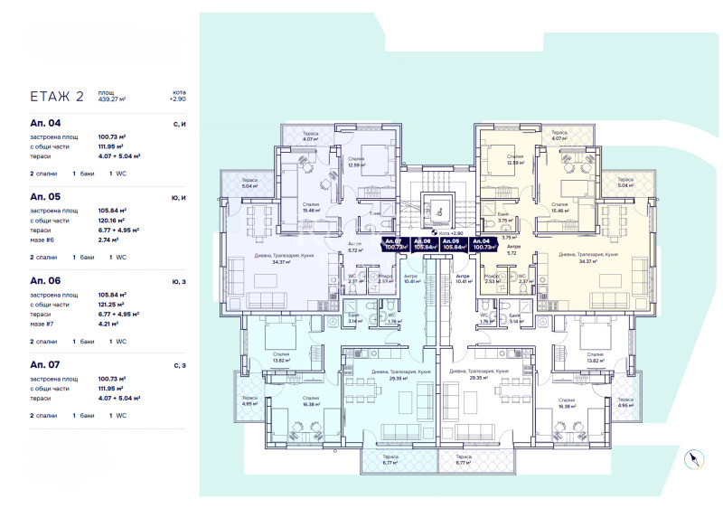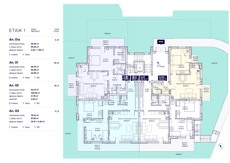 Апартаментът се намира на партерен етаж с обща площ от 98.88 кв.м., от които 89,76 кв.м. са застроена площ. Просторен и изпълнен със светлина, той разполага с голям озеленен двор от 44,98 кв.м.