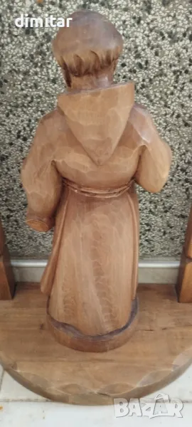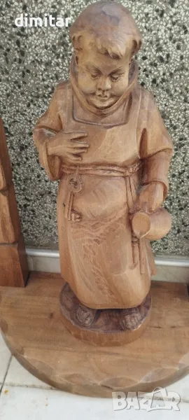 Фигури монах/монахиня и арка дърворезба от масивно дърво, предполагам бук, без драскотини или повреди, лека патина. Височина на фигурата 47см, височина на арката 75см, ширина 40см