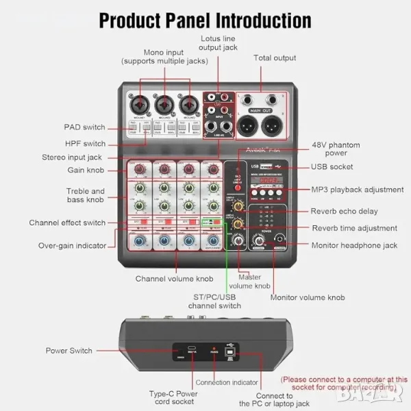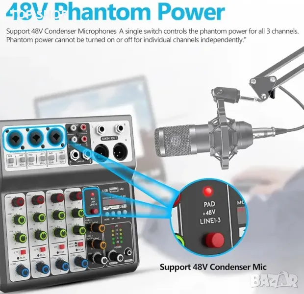 48V фантомно захранване: Звуковият миксер има 3 XLR входа с фантомно захранване. Можете да се чувствате свободни да смените 48V фантомно захранване и аудио миксерът има ултра нисък шум, който позволява да се използва с кондензаторен микрофон.