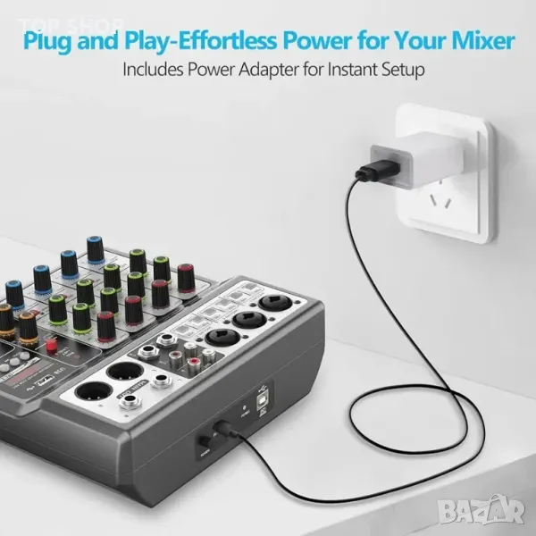 Възпроизвеждане и запис на USB устройство: Лесно включете вашето USB флаш устройство, за да смесвате и възпроизвеждате вашата MP3 музика на този звуков миксер. Възможно е също да запишете аудио изхода на USB памет.