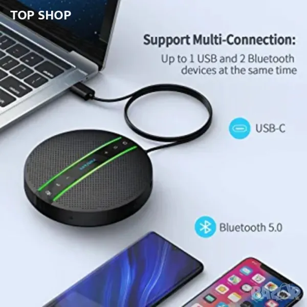 Конферентни разговори чрез USB и Bluetooth връзка, Лесен за използване: можете да свържете това устройство към вашия смарт телефон, таблет, лаптоп...с функцията bluetooth или можете също да включите това устройство към вашия компютър с USB кабел директно, включете и играйте