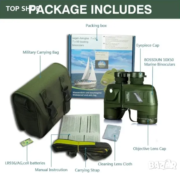 - Морският бинокъл BOSSDUN 10 x 50 е проектиран да отговаря на военните стандарти и да отговаря на всякакви климатични условия и температури от -7°C до + 55°C.