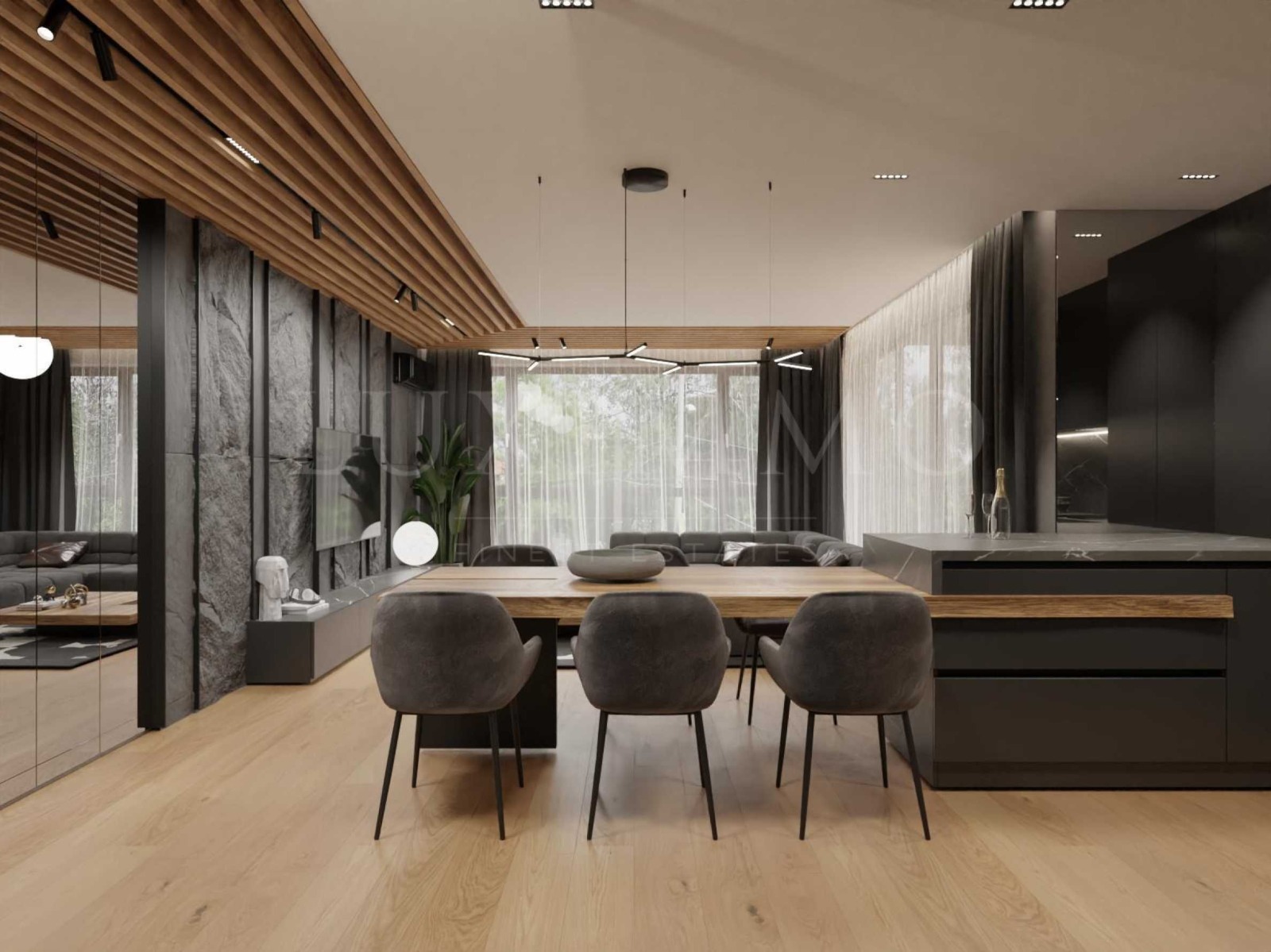 Довършителните работи в жилището са с най-качествените материали - подови настилки от естествен паркет, плочки и санитария от Италия. Имотът може да се дообзаведе по дизайнерския проект, на цена 30 000 евро допълнително.