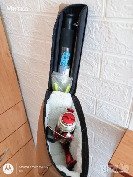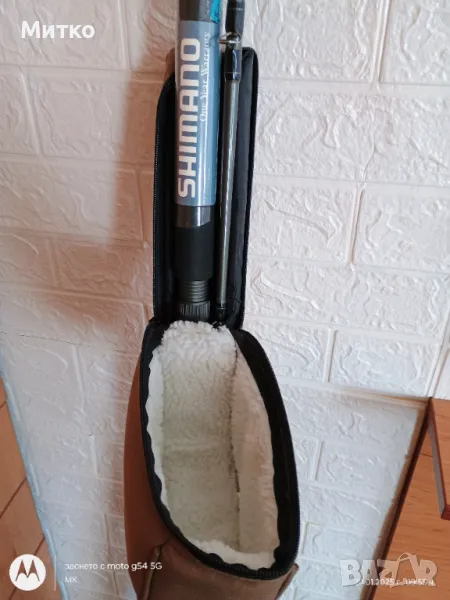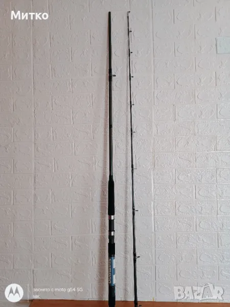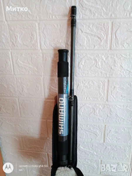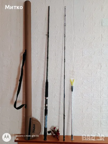 Две секции. Дължина обща 2.80м.Перфектен лек твърд калъф с джоб за една макара. Нова макара и телескопична стойка.Само лично предаване. При куриерски услуги с предварително заплащане и разходи за сметка на получателя.