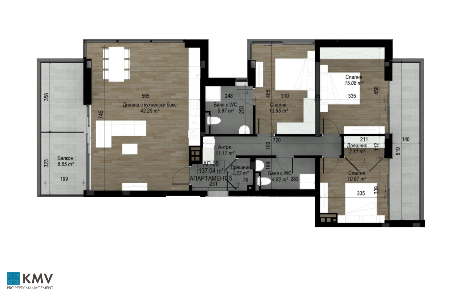Състои се от просторна дневна с кухненски бокс, три самостоятелни спални,дрешник, две бани с тоалетни и балкон.