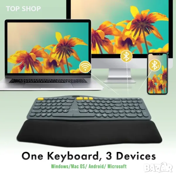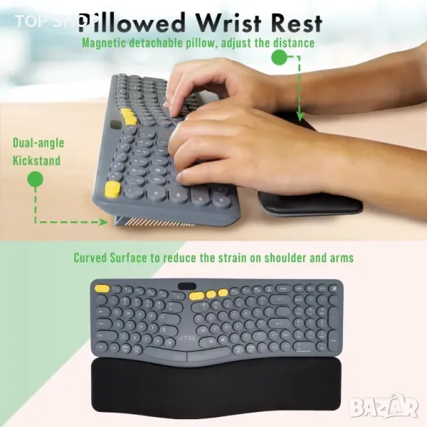 Естетично тяло с ергономичен извит дизайн – Ергономичното извито оформление помага да поддържате китката и раменете си в удобна поза, като същевременно осигурява по-спокойно и естествено изживяване при писане за часове непрекъсната употреба. Включва подвижна опора за китката, за да поддържа китките ви, като намалява напрежението и дискомфорта.Съвместимост с няколко устройства и много системи – Поддържа безжично USB4G, Bluetooth 1 и Bluetooth 2 едновременно свързване. Предлага гъвкавост за свързване към различни устройства и широка съвместимост с настолни компютри, лаптопи, Mac системи, таблети, смартфони и др.Вграден екран с информация за OLED дисплей – Прочетете важната информация за клавиатурите с един поглед, без да се налага да отваряте софтуера. Дисплеят показва капацитет/състояние на батерията, режим на връзка, състояние на зареждане и др.Акумулаторна батерия | 12 мултимедийни клавиша – Няма нужда да се притеснявате за непрекъснато закупуване на батерии, за да използвате клавиатурата. Вградената акумулаторна батерия осигурява един месец непрекъсната употреба с едно зареждане. 12 допълнителни клавиша FN + Multimedia позволяват бърз достъп и лесно управление на вашия компютър. Осигурява работен обхват до 10 м/33 фута.