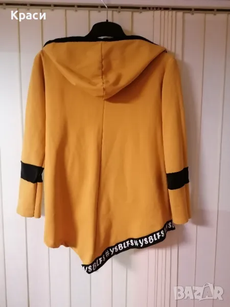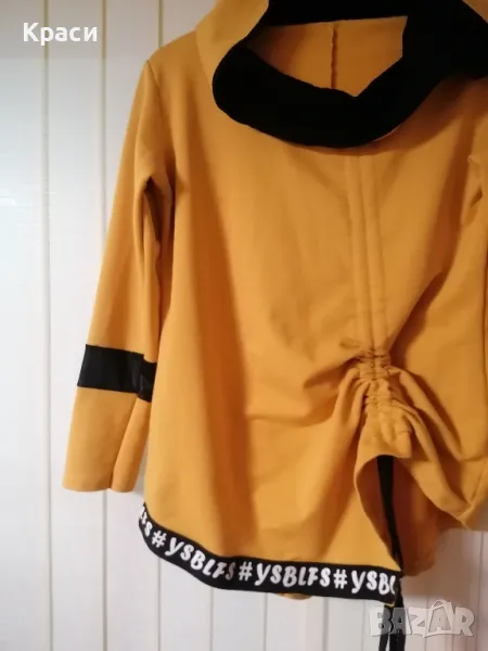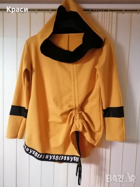 Дамска блуза с качулка, има връзки които като се издърпат променят визията на блузата. При нужда ще измеря дължини и ширини.
