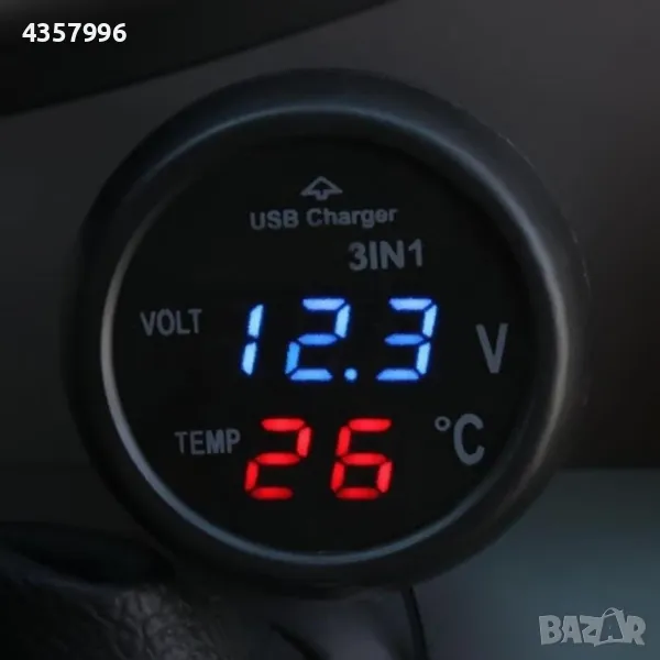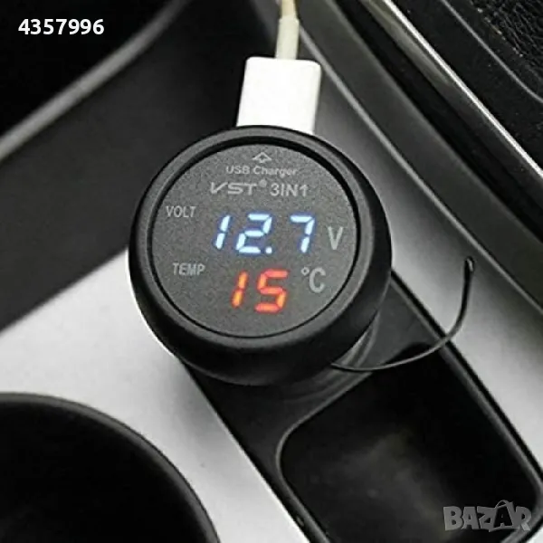 Волтметър,Термометър и USB зарядно за кола, уред три в едно.