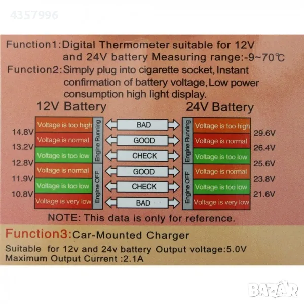 Напрежение: Работи както за автомобили така и за камиони, 12V или 24V.