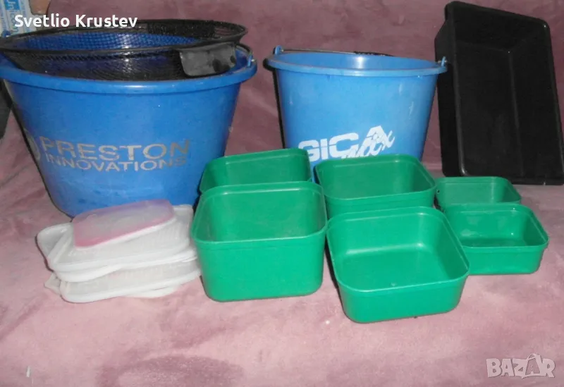 Кофа Престън 20л,сито,кофа Гица 10л,кутии Стонфо 3бр големи,1бр средна и 2бр малки.