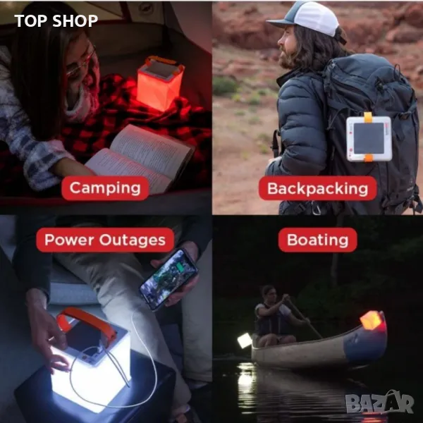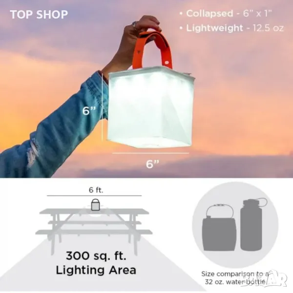 Изключително преносимо и компактно устройство „всичко в едно“: Това устройство е захранвано от слънчева енергия зарядно за телефон, разширяем фенер за къмпинг и резервна батерия „всичко в едно“. С тегло само 12,5 унции, този задължителен аксесоар за къмпинг е мощен, но не утежнява багажа ви. Разширява се до 6-инчов куб с уникалния си дизайн за завъртане и надуване и се свива до дебелина 1 инч.