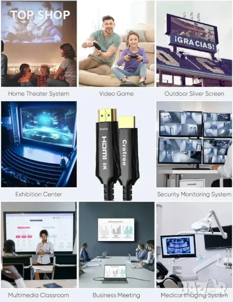 Съвместимост: Един 50 фута (15 м) оптичен кабел Cratree 8K HDMI 2.1 cl2 с дебелина на стената 0,16 инча (4,8 мм), plug and play, съвместим с версии 2.0/1.4/1.3/1.2/1.1