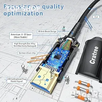 Качествено надграждане: оптичният HDMI кабел Cratree 8K е направен от американски лазерен Ⅱ- и немски чип за драйвер на силициева линия. В същото време той е направен от cl2 противопожарен слой, антикорозионен 24K позлатен конектор и корпус от алуминиева сплав. Вътре в линията има 4 слоя екраниране, което може ефективно да намали загубата на сигнал и има характеристиките на силна способност против смущения. Той е строго тестван за въртяща се глава и функционалност.