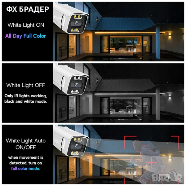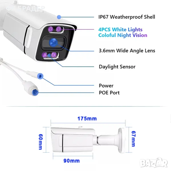Устойчив дизайн: Камерите са водоустойчиви и подходящи за вътрешно и външно ползване.