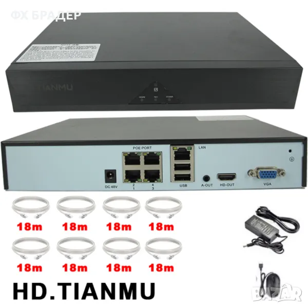 Кабели: 8БР. Ethernet кабела (по 18 метра всеки) за свързване на камерите с NVR.