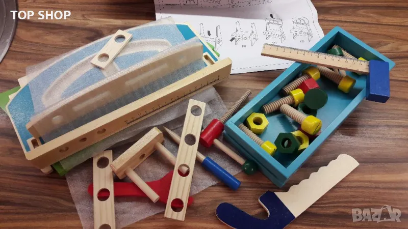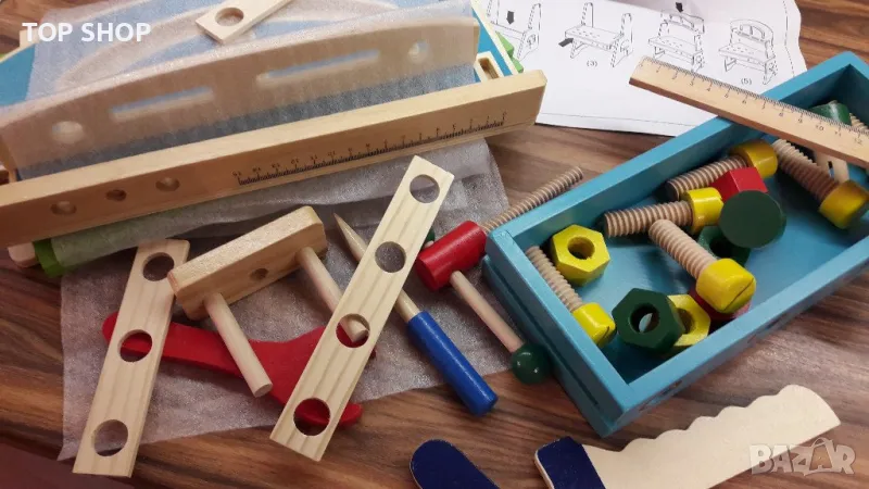- Дървени инструменти- права отверка, ъгъл с линия, трион, гаячен ключ.