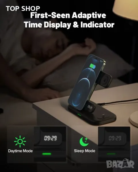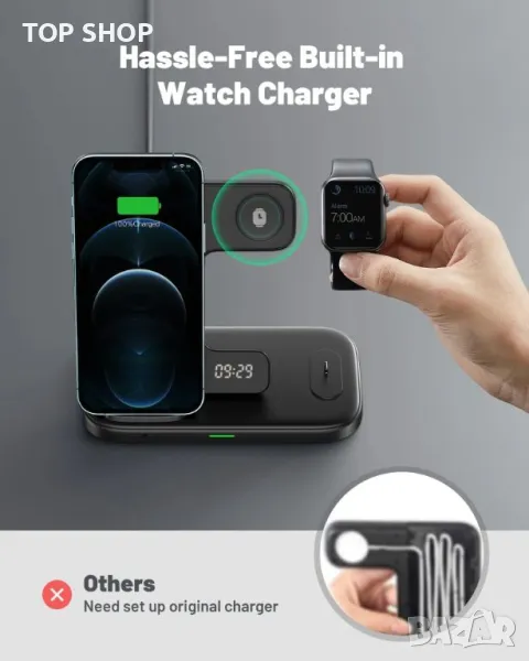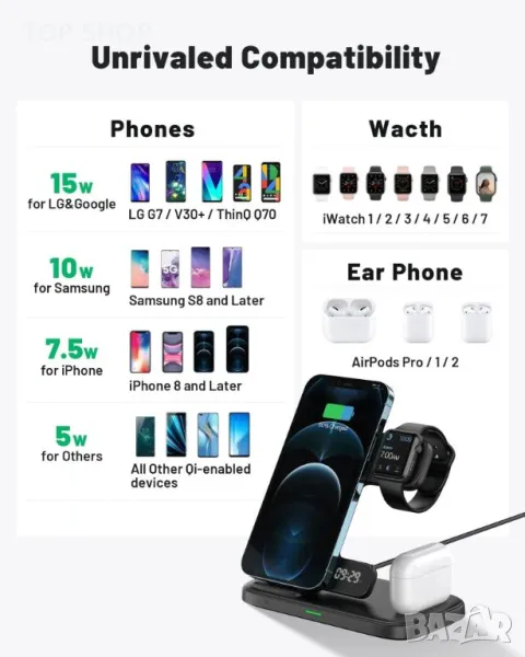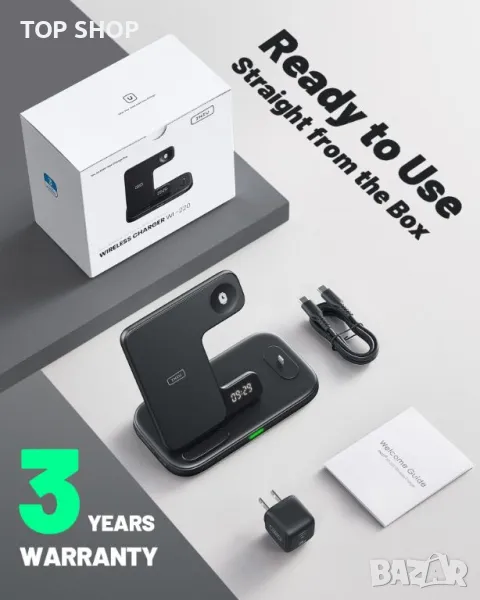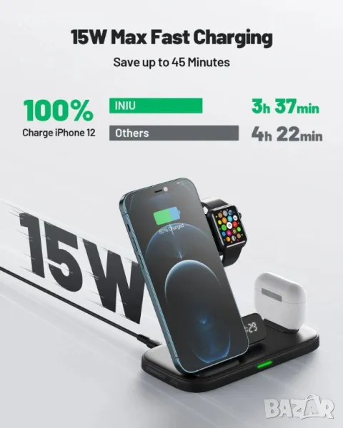 Просто поставете вашите 3 любими устройства и максималното бързо зареждане от 15 W ще съкрати невероятно поне 45 минути време за зареждане на телефона. Първият показван адаптивен дисплей за време и индикатор ви позволяват да проверявате времето и състоянието на зареждане, без да вдигате телефона си. И те автоматично ще регулират светлината си въз основа на условията на околната среда, без досадна светлина, докато вашата красота спи. Елиминирайки обикновения микро вход, INIU AirFuel 3 в 1 приема най-новия PD 3.0 USB C вход за най-стабилното и ефективно бързо зареждане. В кутията: INIU AirFuel 3 в 1 безжично зарядно устройство*1, 25W mini USB-C захранващ адаптер*1, USB C кабел*1 и ръководство за потребителя*1. Съвместими модели за 【iWatch】Apple Watch 8 / Ultra 7 / SE / 6/5/4/3/2; 【AirPods】AirPods Pro 2 / pro / 3-то поколение 2021 / AirPods Pro /2/1; 【iPhone】Apple iPhone 14, iPhone14 plus, iPhone14 pro, iPhone 14 pro max, iPhone 13, iPhone 13 Pro, iPhone 13 Pro Max, iPhone 12, iPhone 12 Pro, iPhone 12 Pro Max, IPhone 14/14 Pro/14 Pro Max/13/13 Pro/13 Pro Max/12/12 Pro/12 Pro Max/iPhone 11, iPhone 11 Pro, iPhone 11 Pro Max, iPhone SE 2 поколение, iPhone X, iPhone XS, iPhone XS Max, iPhone XR, iPhone 8, iPhone 8 Plus; 【SAMSUNG】