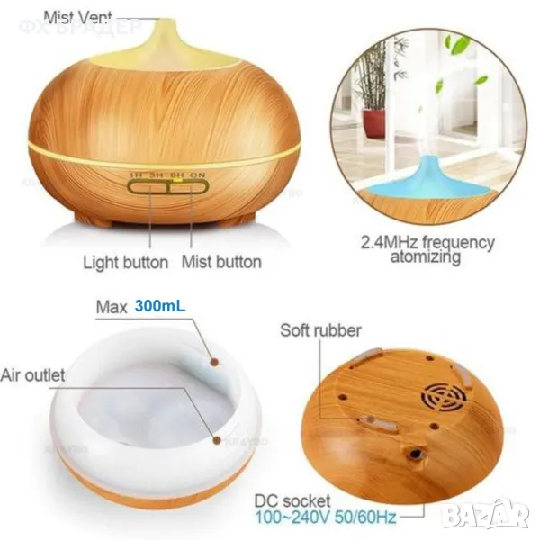 Този дифузер за аромат използва ултразвукови вълни за мигновено изпаряване на водата и етеричното масло в резервоара, за да се получи студена, суха ароматна мъгла.