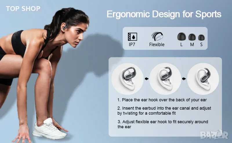 Гъвкав дизайн на кука за уши и водоустойчивост IP7, идеални за спорт: Спортни безжични слушалки с гъвкава кука за уши, за да ви държат мотивирани, сигурно прилягане, което няма да се размести или изпадне по време на дълги часове тренировка и без кабели, които да ви задържат . Предлага се с 3 различни размера за удобно и сигурно прилягане, по-добро уплътнение, по-добър звук. Защитата от пръски IP7 предпазва тренировъчните слушалки от капка вода или повреда от пот. Слушалките за бягане могат да се поберат за къмпинг, бягане или тренировка, дори в дъждовен ден.