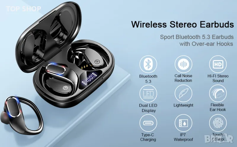 слушалки с куки за уши, безжични слушалки с двоен микрофон, поглъщащ звук, IP7 водоустойчива Bluetooth слушалка, двоен LED дисплей, 56H слушалки за време за игра за фитнес зала