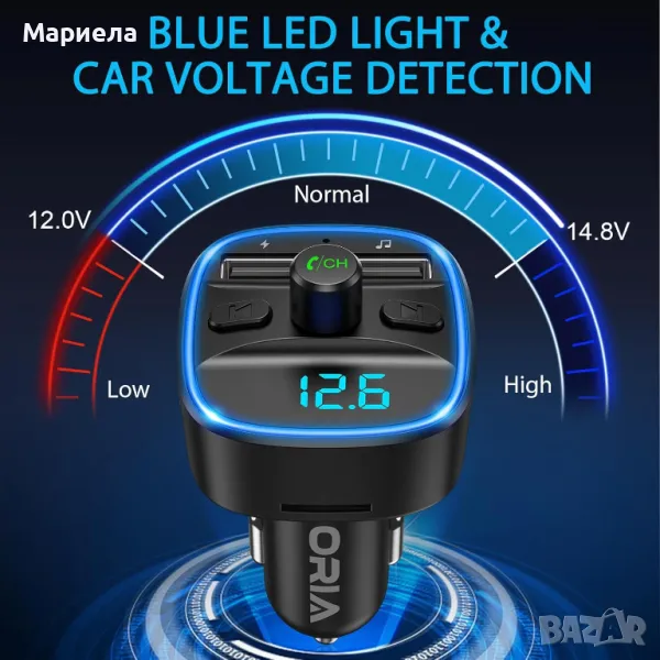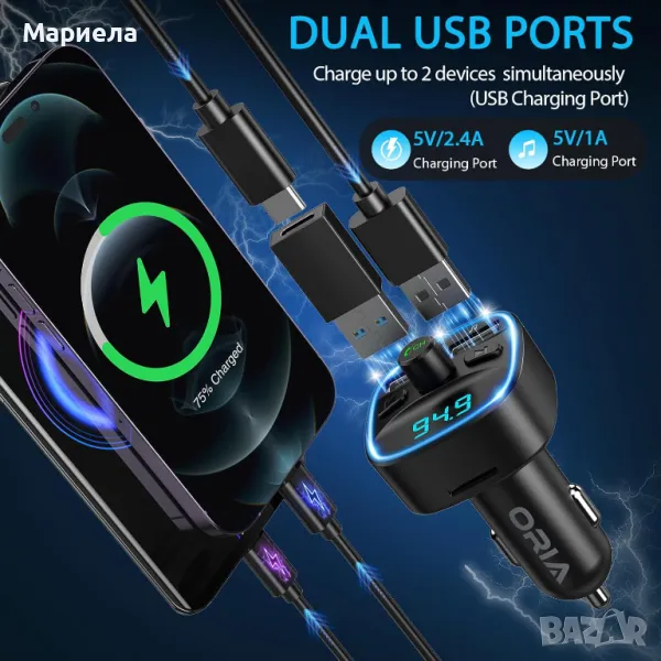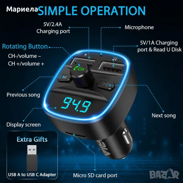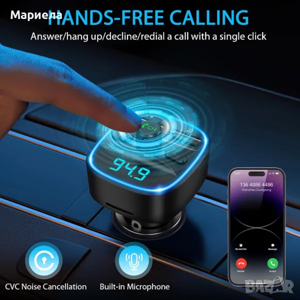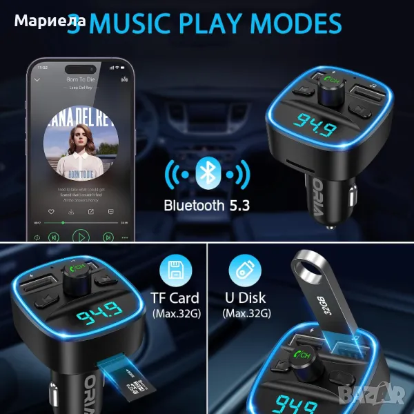 С FM трансмитера можете да слушате музика през Bluetooth функция; възпроизвеждане на USB флаш устройство (≤ 32 GB); TF Kart (≤ 32 GB).