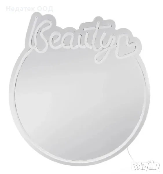 Кръгло огледало с LED неонови контури 5W, 1A и надпис "Beauty" в горната част.