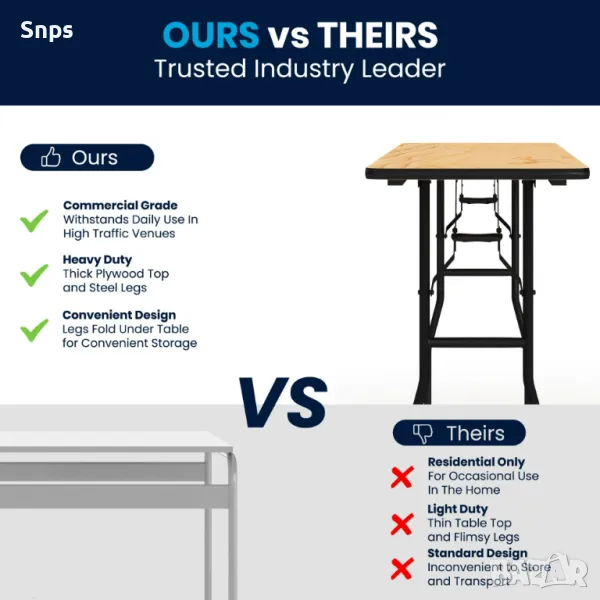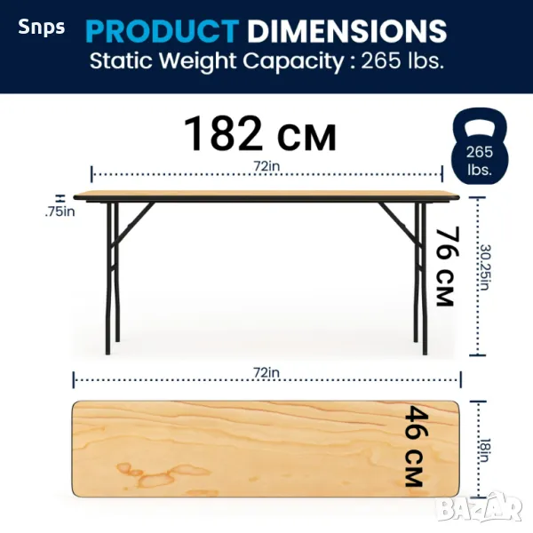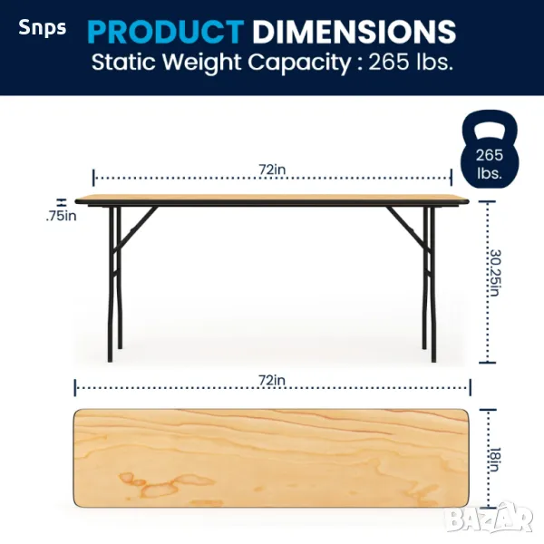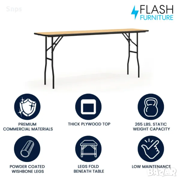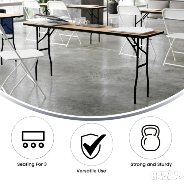 Независимо дали назначавате нови служители или провеждате месечно обучение по безопасност, присъстващите ще имат нужда от работно пространство. Тази 6' правоъгълна дървена сгъваема маса може да се съчетае с други и да се постави в редове, в стил класна стая или в "U" формация за вид на конферентна зала. Тази маса за семинари е полезна в множество условия, включително банкетни зали, конферентни центрове и училища. Използвайте в дома за допълнително пространство за хранене, за държане на вашата шевна машина или в пералното помещение за сгъване на дрехи или съхранение на вашите почистващи препарати. Ако нямате много място за постоянна настройка, краката се сгъват под масата, за да направят съхранението по-удобно и за по-добра преносимост. Включените подови капачки предпазват подовата настилка. Тази маса е с търговски клас, за да издържи на ежедневна употреба в хотелиерството.