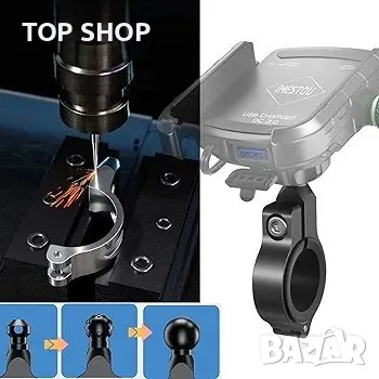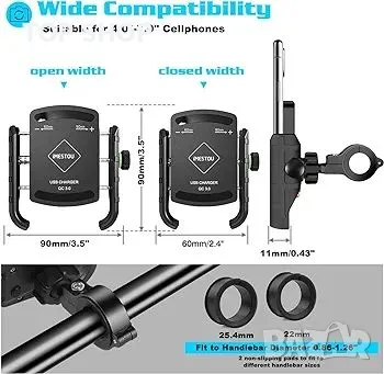 100% здрав и надежден: Изработено от алуминий, USB зарядното за телефон за мотоциклет може да се монтира по-стабилно на кормилото. Регулируемите затягащи рамена, които могат да се регулират максимално. Широчина 90 mm надеждно държи повечето смартфони от 4,0 до 6,8 инча.