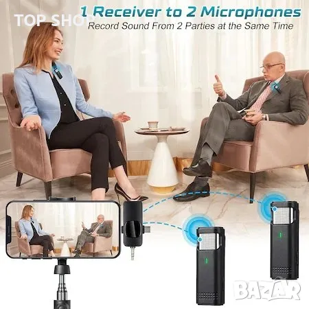 Два безжични микрофона: Този комплект съдържа 2 микрофонни предавателя, 1 приемник и 2 кабелни адаптера, които ви позволяват да записвате звук или видео от 2 страни едновременно. Разбира се, можете да използвате един от микрофоните отделно. Опростен и професионален дизайн за влогъри, YouTubers, блогъри, интервюиращи и други ентусиасти по видеозаписи.