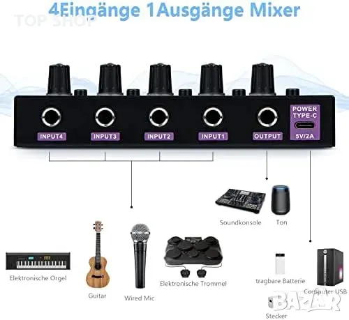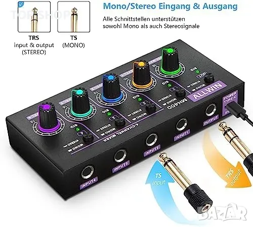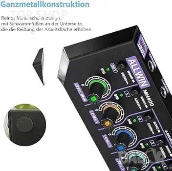 ALLWIN DC5V 4-канален мини аудио миксер 4 в 1 изход Моно и стерео поддръжка за субмиксер
