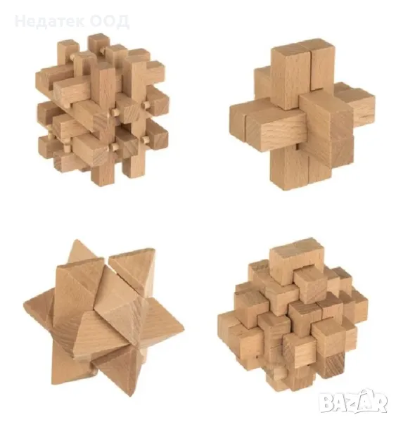 Дървени пъзели, които са гатанки. Разделете частите от всяка форма и опитайте да ги свържете отново, за да получите оригиналната форма. Не е лесно, но усилията ще изострят ума ви!