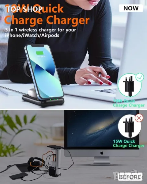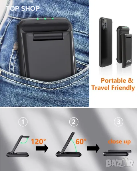Безжична станция за зареждане 3 в 1: Кажете сбогом на разхвърляното бюро/нощно шкафче, това безжично зарядно устройство е с дизайн 3 в 1, може да зарежда телефона, часовника и слушалките ви едновременно. Сгъваем дизайн и достатъчно лек, за да се побере в чантата или куфара ви, независимо дали сте у дома, на път или на работа, това безжично зарядно устройство 3 в 1 ще бъде вашият добър партньор.