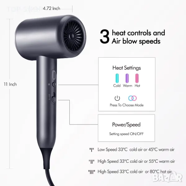 МНОГО НАСТРОЙКИ ЗА РАЗНООБРАЗНИ УПОТРЕБИ: Нашият сешоар предлага 3 настройки за топлина и 3 настройки за скорост, както и бутон за охлаждане, за да ви помогне лесно да постигнете стила, който искате. Подвижната дюза за концентратор и приставката за дифузер осигуряват разнообразни опции за оформяне на различни типове коса, като например къдрава коса.