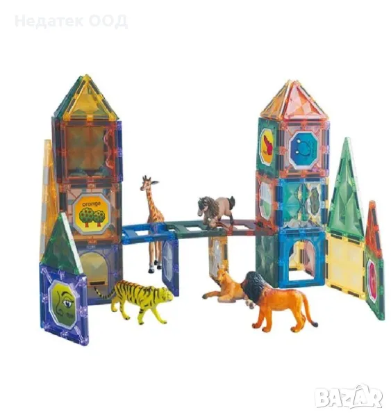 Магнитни цветни тухлички на тема зоопарк в различни форми за безброй конструкции и уникален дизайн. Пакетът съдържа 77 тухлички за композиции.