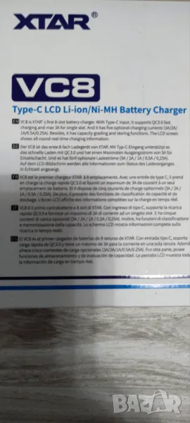 Xtar VC8 е 8-канално зарядно устройство, което поддържа Li-ion, NiMH и NiCd батерии. Това зарядно устройство поддържа QC3.0 бързо зареждане и има максимум 3A ток за всеки слот. Това може да се промени ръчно на 3A, 2A, 1A, 0.5A или 0.25A, което позволява на потребителя да регулира тока към батериите. Xtar VC8 използва USB-C вход за по-бързо зареждане на батериите. LCD екран предоставя информация в реално време: напрежение, капацитет, вътрешно съпротивление и тип батерия. VC8 има два потребителски режима: Grade и Storage. Режим Grade тества истинския капацитет на батериите ви, така че ще знаете на какво са наистина способни. Режим Storage на съхранение улеснява зареждането или разреждането на батериите до номиналното му напрежение, за да увеличите живота на батериите .